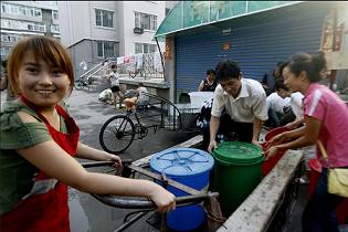 自7月31日被洪水沖斷自來水輸水管線至今,吉林省通化市全市停水已經超過48小時,市區33萬人面臨用水難題。消防部門和城建部門調運25臺送水車,循環給居民送水,通化市隨處可見提著水桶找水的市民.